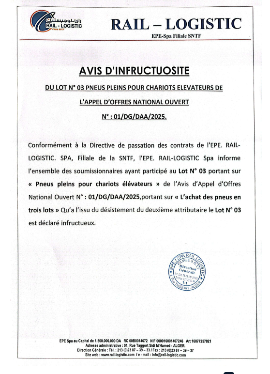Appel d’offre n° 01/DG/DAA/2025: Avis d’infructuosité LOT N° 03